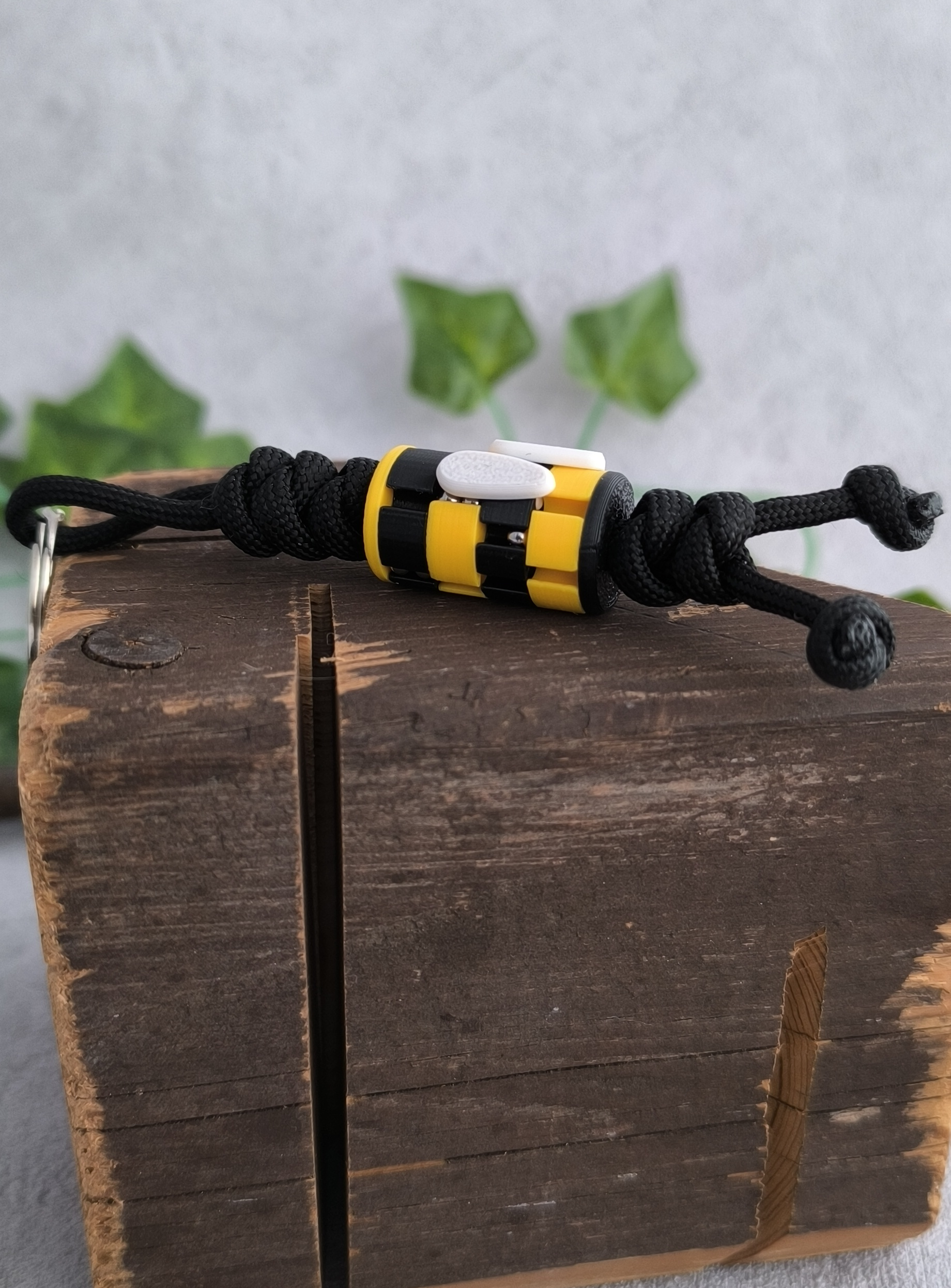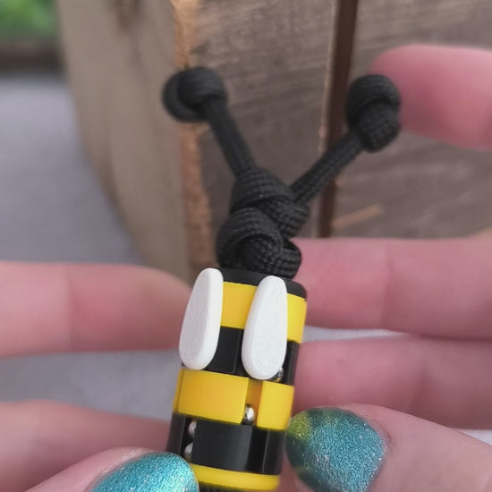 The Keychain consists if a lanyard and a 3D Printed bead with several mocing parts and little enclosed steel balls. The Balls, same as the wings of the bee, can move around the channels in the bead.