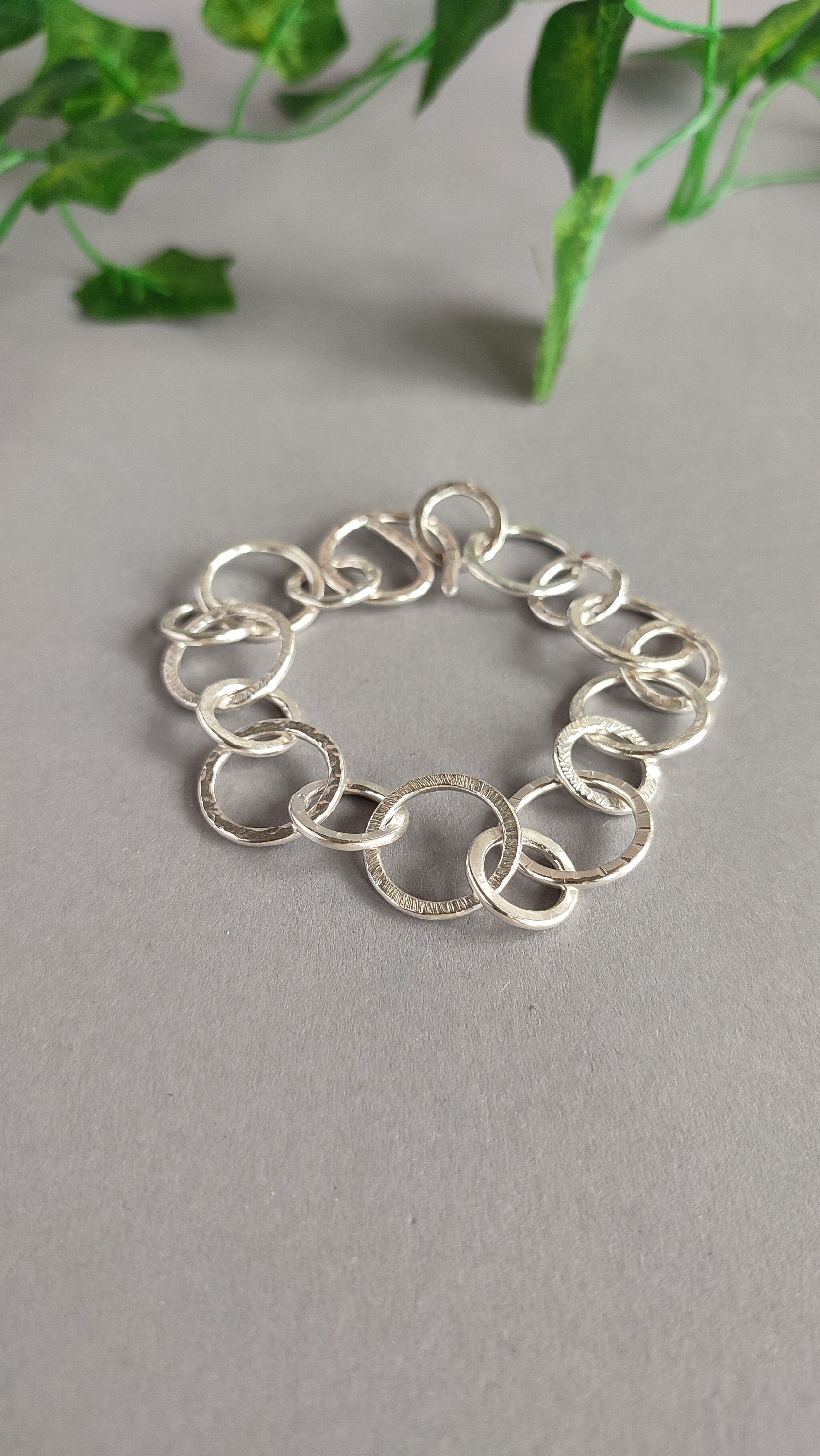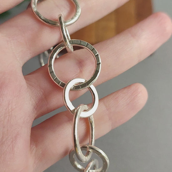 The bracelet is made out of big and small links with 8 different surface structures. You can feel the differences in textures with your fingers for some haptic enrichment. The hook clasp can be closed on multiple links, allowing for different sizing.