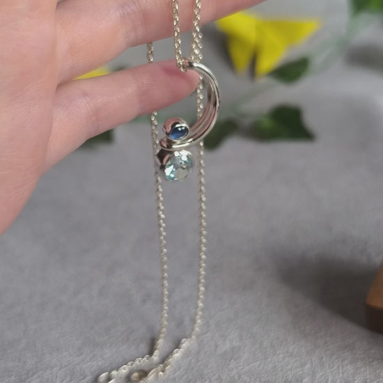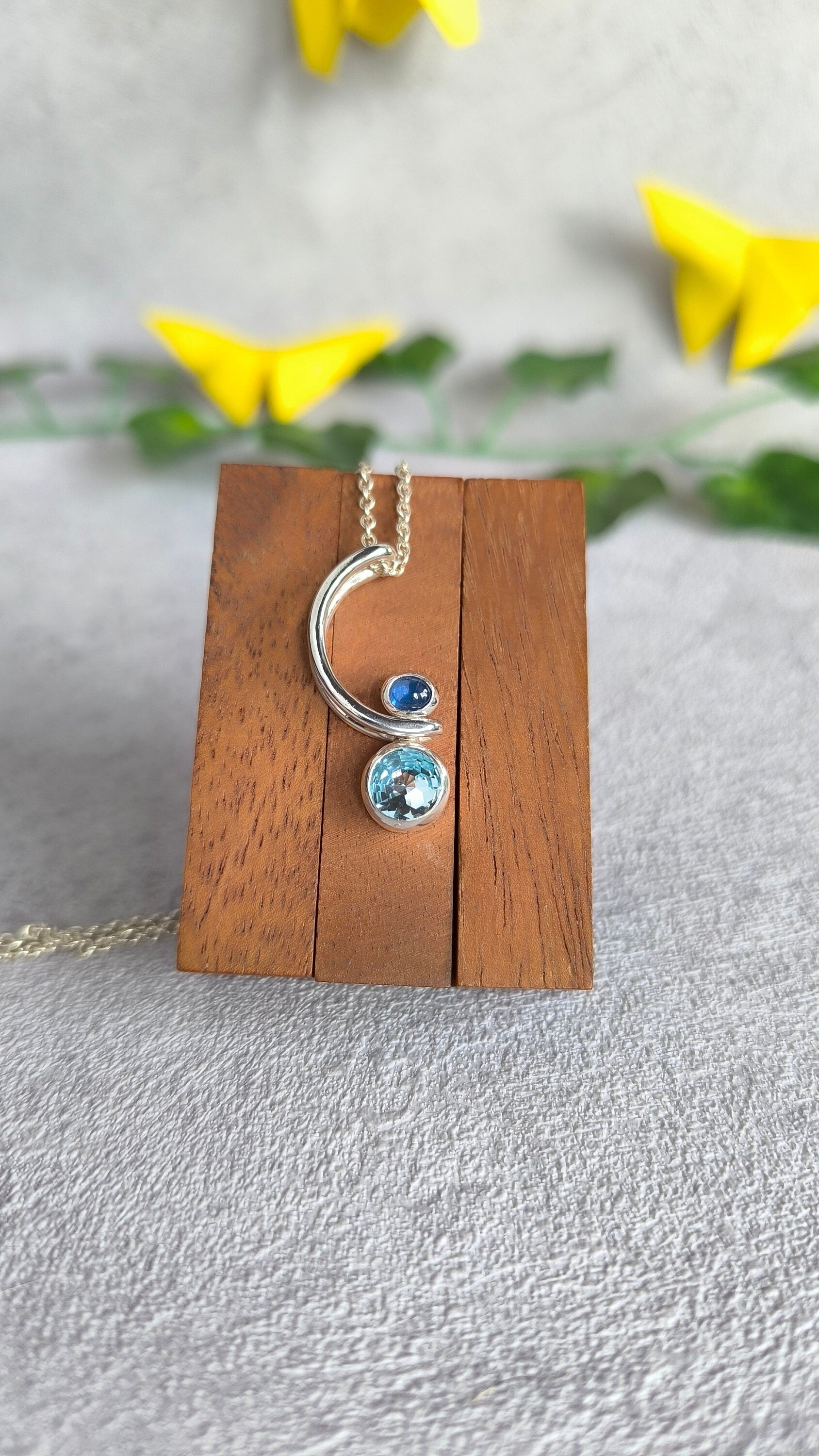 Two stones hang in a half circle railing: a dark blue sapphire and a light blue topas in a special flower cut. The half circle holding the stones creates a negative space and an image of fragile balance.